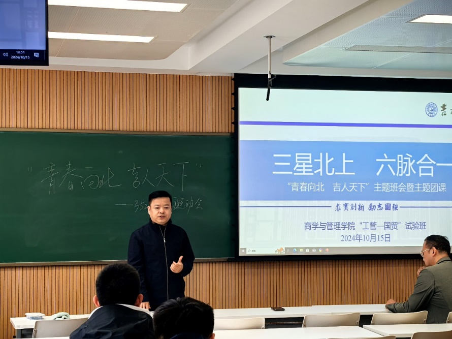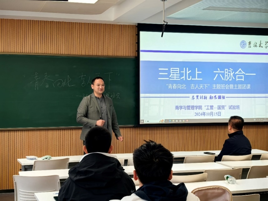 为严格落实“时代新人铸魂工程”,深入学习姜治莹书记在2024年“新生第一课”的专题报告,10月15日上午,tyc41183太阳成2024级工商管理—国际经济与贸易(双学士学位)试验班在敬信楼E105教室举办“青春向北,吉人天下”主题班会暨主题团课活动。“工管—国贸”班团支书范浩然主持活动,班主任马鸿佳老师、孙黎老师,辅导员助理姜鹄学长出席。