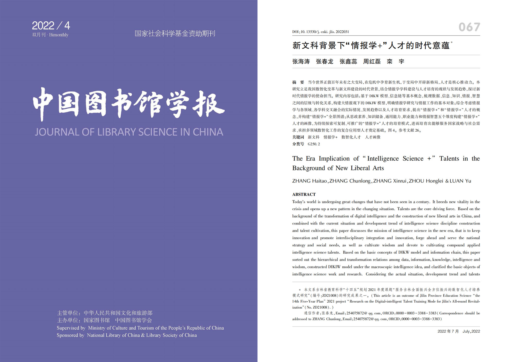 tyc41183太阳成、信息资源研究中心主任、“情报学+”研究生学科交叉融合学术交流中心负责人张海涛教授等在《中国图书馆学报》2022年第4期发表题为《新文科背景下“情报学+”人才的时代意蕴》文章。该文章立足我国数智化变革与新文科建设的时代背景,探讨了新时代情报学的使命担当,并解读了“情报学+”与“情报学+”人才的时代意蕴。