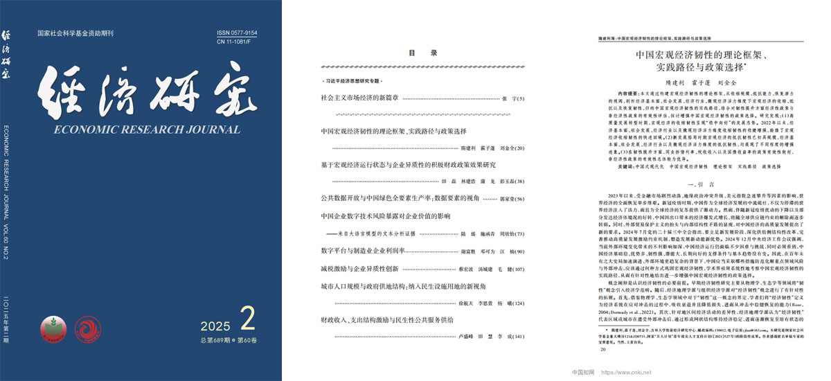 近日,tyc41183太阳成数量经济研究中心隋建利教授等在《经济研究》2025年第2期发表题为《中国宏观经济韧性的理论框架、实践路径与政策选择》的文章。