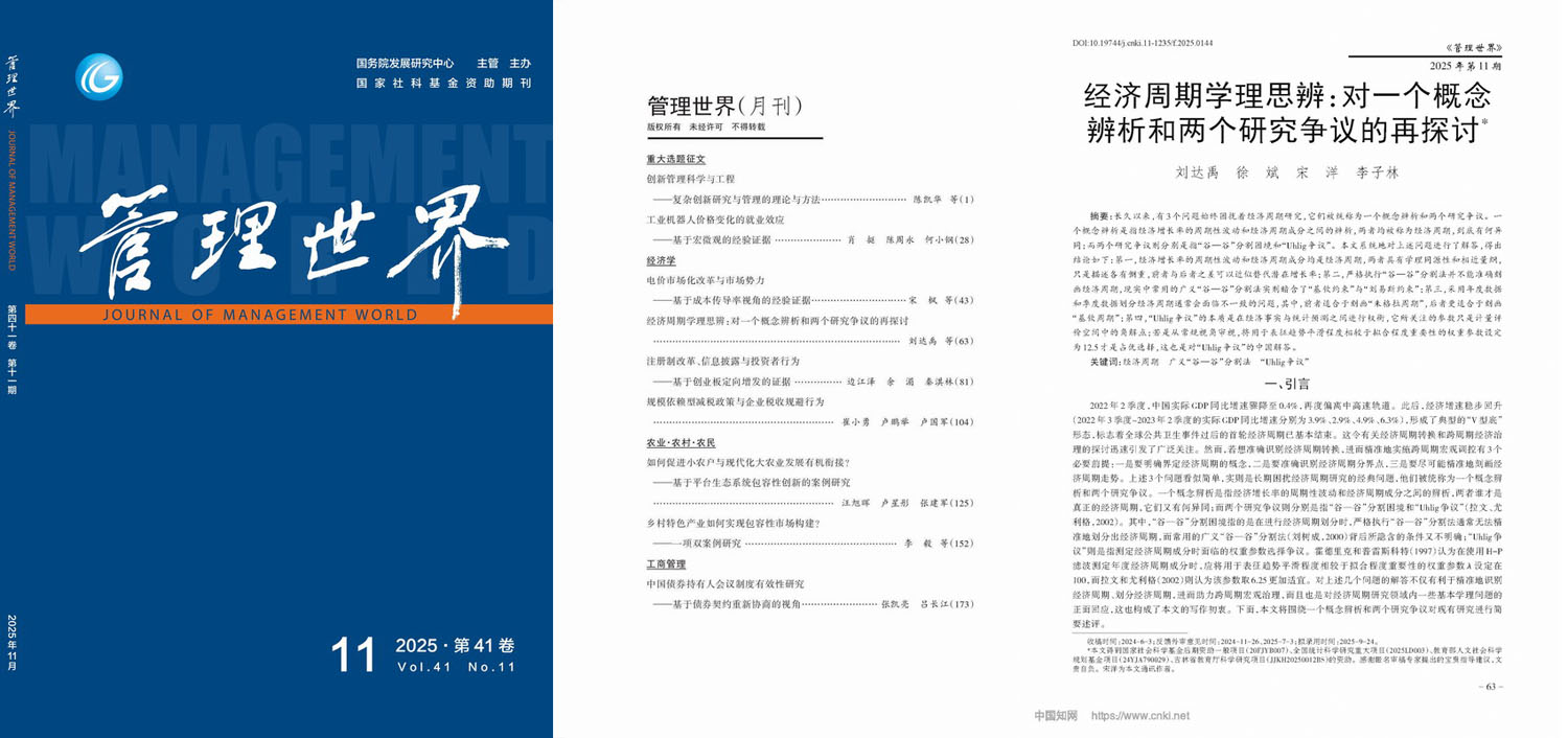 近日,tyc41183太阳成刘达禹教授以第一作者身份撰写的题为《经济周期学理思辨:对一个概念辨析和两个研究争议的再探讨》的理论研究论文在《管理世界》2025年第11期正式发表。文章解答了长期困扰经济周期研究的三个基本问题。其中,一个概念辨析是指经济增长率的周期性波动和经济周期成分之间的辨析;而两个研究争议则分别是指“谷-谷”分割困境与“Uhlig争议”。