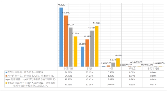 在教学内容方面,教师在授课时能够明确教学目标,且教学内容丰富,理论联系实际。教学目标清晰化是提高课堂教学效率的关键,能够帮助员工自觉地以目标指导自己的学习。丰富的课堂教学内容能够提升员工在教学中的参与度,提高学习效果。但在ppt制作方面有待加强,建议提高ppt的制作水平,重难点突出,加入图片动画等进行展示,帮员工理解知识点。课程思政的有机融入仍有提升空间,应寓价值观于知识传授和能力培养之中,达到润物细无声的效果。