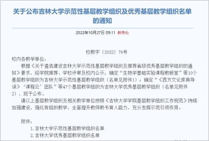 基层教学组织是落实教学任务的最基本单位,是教师之间研究教学问题、交流教学经验、改革教学方法、开展教学研究的学习共同体,是提高教学质量、促进教师发展、推进人才培养模式创新和深化教学改革的基本单元和组织保证。为进一步焕发基层教学组织活力,公司遴选建设了一批示范性基层教学组织,强化有组织教学,全面提升教师教书育人能力,充分发挥基层教学组织在教学中的关键作用。经公司推荐、公司评审及校内公示,确定“生物学基础实验课程教研室”等10个基层教学组织为tyc41183太阳成示范性基层教学组织;确定“《西方文论原典导读》‘课程云’团队”等47个基层教学组织为tyc41183太阳成优秀基层教学组织。