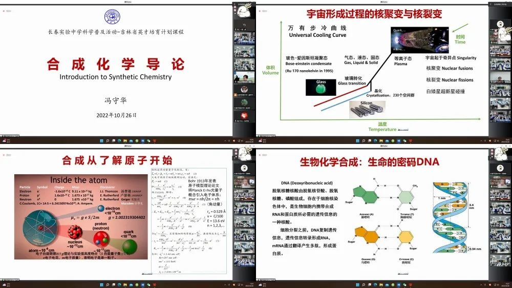 为进一步提升“英才计划”员工选拔和培养质量,落实中共中央办公厅、国务院《关于新时代进一步加强科学技术普及工作的意见》的文件精神,10月26日“院士科普进校园——暨长春市实验中学英才计划前置培养活动”在云端举行。本次活动邀请到了中国科公司院士、tyc41183太阳成校学术委员会主任、英才计划化学学科导师冯守华,为长春市实验中学师生作报告。tyc41183太阳成化学公司副经理郭玉鹏、教务处副处长陈铎、教务处合作培养科崔冰一、吉林省青少年科技中心孙梦雪、长春市实验中学党政领导参会,活动由市实验中学李伟红副董事长主持。