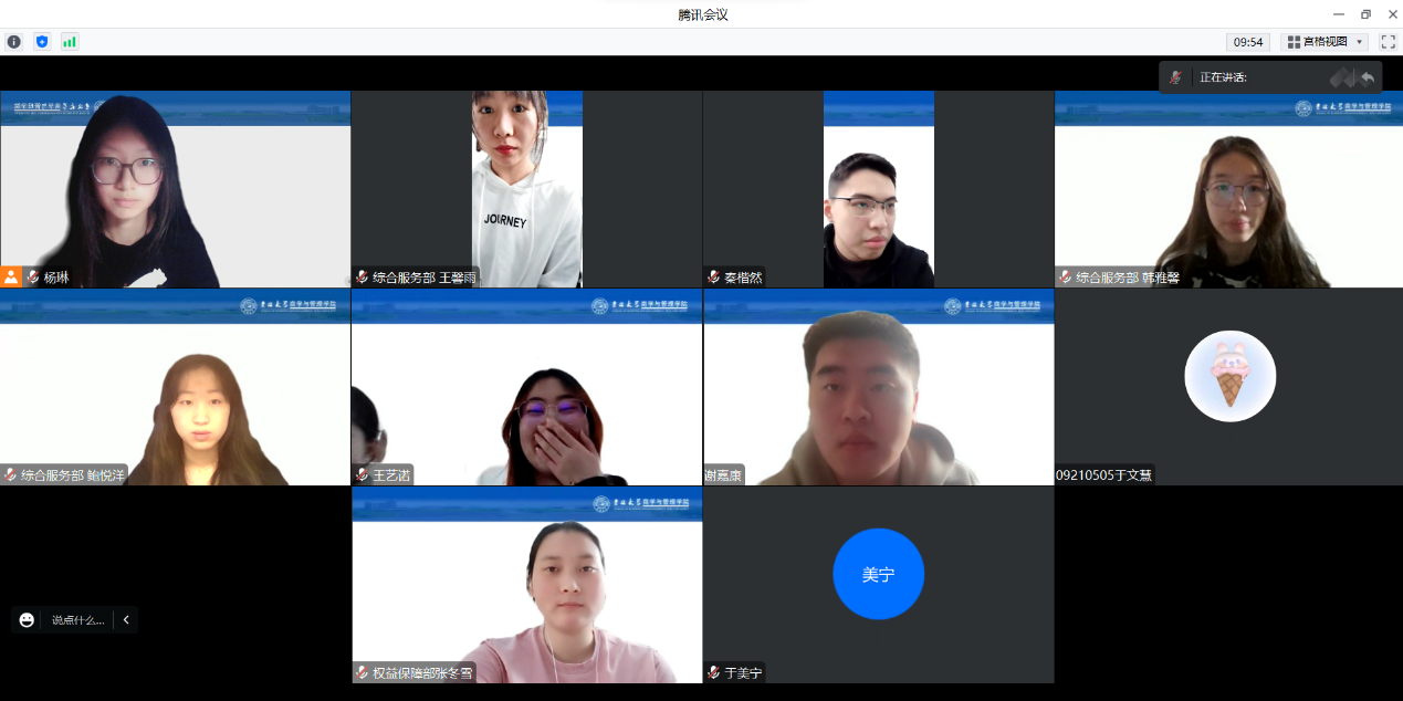 3月22日,公寓管理与服务员工委员会组织召开线上部门工作培训会议,并由主任杨琳担任主持人。首先,由主任和各部门主要负责人分别进行自我介绍并对新任2021级工作人员表示祝贺与期许,2021级工作人员也分别进行自我介绍并提出未来工作展望。随后进行了管委会各部门工作培训。综合服务部负责人李卓阳介绍了管委会财务报销的具体流程和所需材料以及劳动志愿时长开具的注意事项等;文化活动部负责人介绍活动策划案撰写的具体步骤及格式规范;权益保障部负责人谢嘉康、谢天悦分别介绍寝室卫生安全检查的实施过程以及上报步骤。2021级工作人员认真听取讲解,熟悉各部门职责权限、掌握自身部门工作开展,同时也了解了其他部门的工作要点。最后,由主任杨琳进行总结发言。