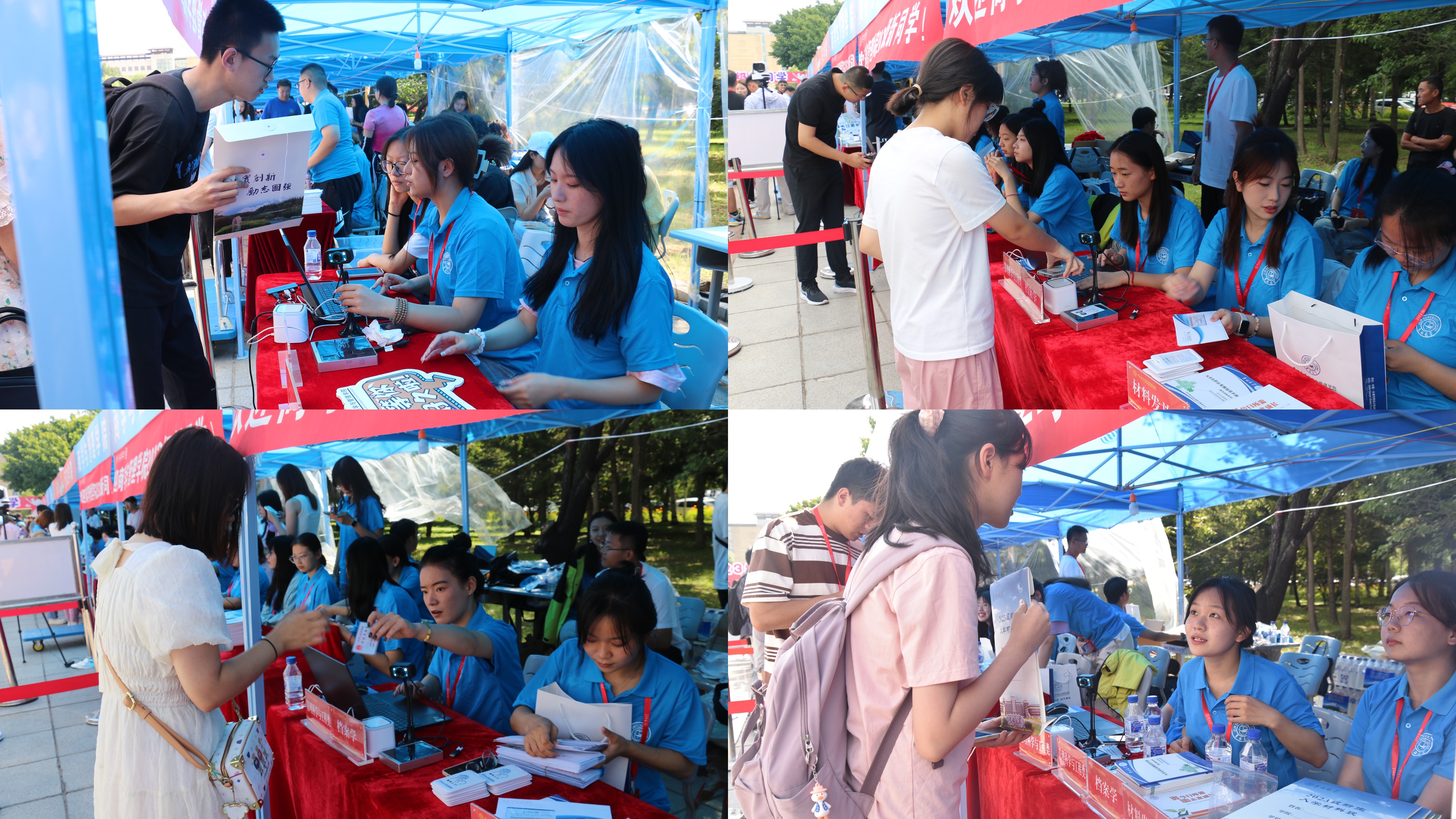 2023年8月26日,迎新工作进入第二天,今日将迎来报到人数高峰,但志愿者们依旧热忱高涨,以百分百的状态投入到新生报到工作中。