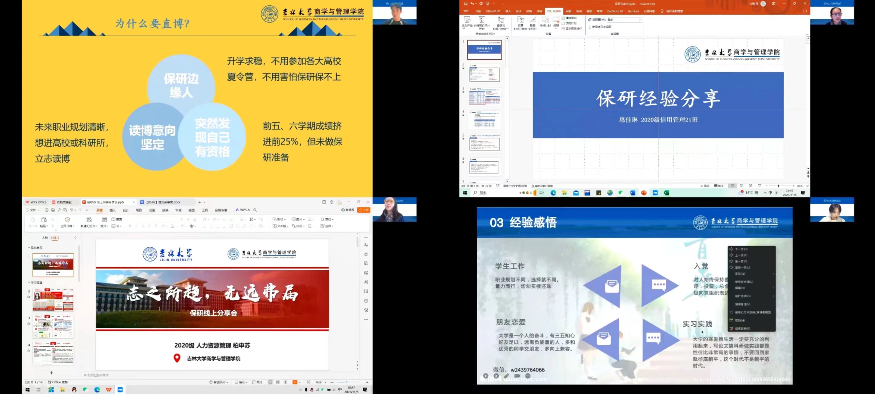 紧接着由人力资源管理专业的柏申苏同学分享经验,她以综合专业第一名的优异成绩保研至中国人民大学人力资源开发与管理专业。柏申苏学姐首先介绍了自己的学习、竞赛成绩以及科研水平,耀眼成绩的背后是无数的汗水与努力。随后,她通过分享自己的保研经历,向大家阐述保研的必备能力,同时强调了心态的重要性。