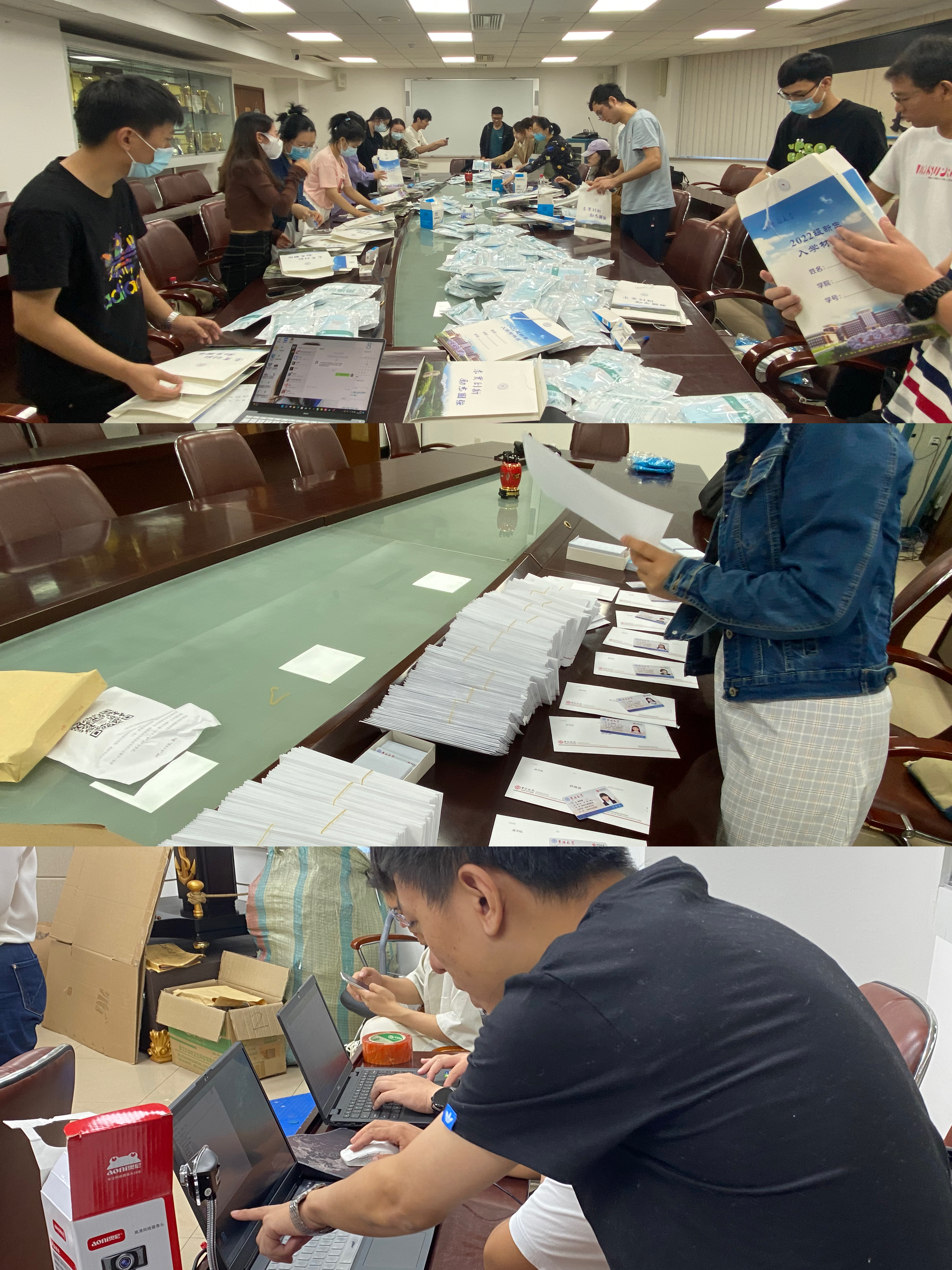 随后,裴月莹老师和王敬乔老师分别介绍了迎新工作的任务分配、前期筹备以及迎新系统的操作说明。其中具体包括:一卡通、银行卡以及健康包的整理工作、北三北四南五南六的寝室检查工作、迎新点现场的布置工作以及迎新当日的各项任务工作。经过老师们合理有效的安排,所有与会成员根据不同的工作任务分成了几个小组。会议结束后,各小组便开始有条不紊的展开了各项工作任务。他们严谨细致、认真周到,不遗漏、错漏任何一个环节,各个点位都能看到穿着蓝色衣服的迎新志愿者们四处奔波,尽心尽力为迎接新生贡献自己的一份力量。马腾老师、裴月莹老师和王敬乔老师也坚守在现场,指导迎新志愿者们高效的开展工作。