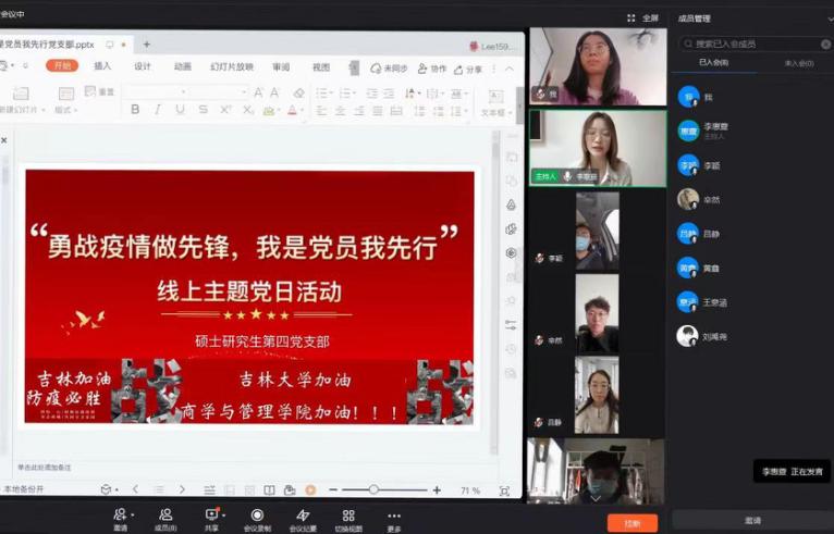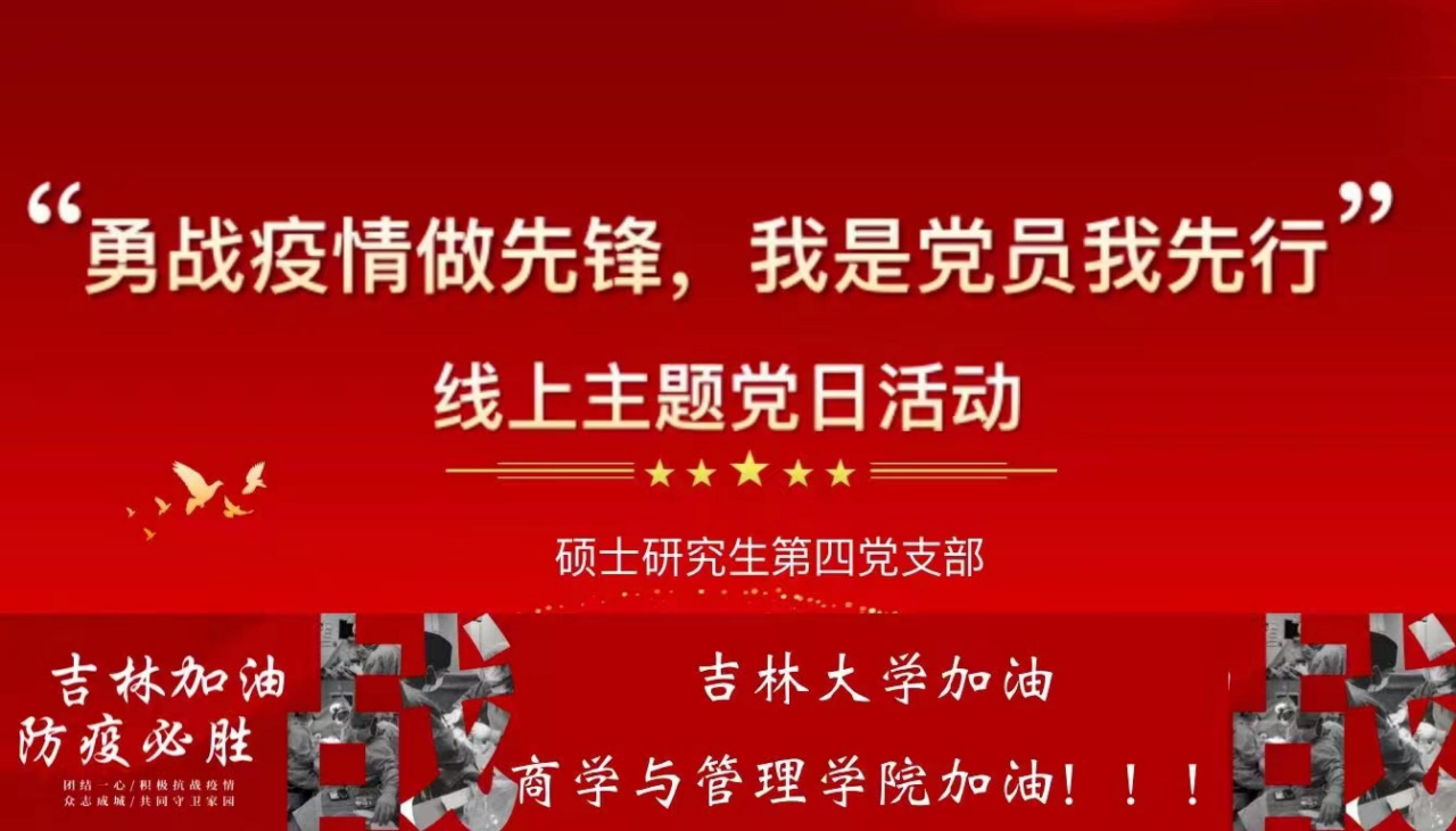 为深入贯彻落实习近平总书记关于新冠疫情防控工作的重要讲话重要指示精神,落实tyc41183太阳成疫情防控工作会和相关要求,结合公司实际,鼓励大家继续坚定信心抗击疫情,tyc41183太阳成硕士研究生第四党支部开展于4月27日,下午17:10在线上钉钉会议室开展了以“勇战疫情做先锋,我是党员我先行”为主题的党日活动,调动党员及党员干部抗疫的积极性,增强党员们带领群众打赢抗疫战的信心。