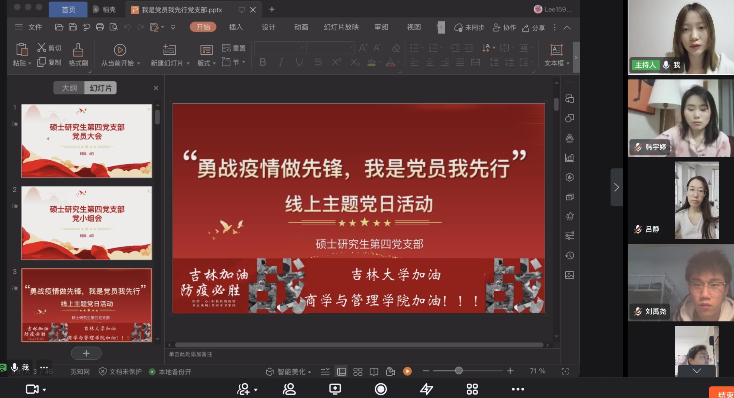 活动开始,支部书记李惠萱同志宣读了中共中央政治局常务委员会召开的关于“分析新冠肺炎疫情形势 部署从严抓好疫情防控工作”的文件精神,重申关于疫情防控的各项注意事项及相关指示,并且告知大家国家也一直在积极地为精准防控努力,希望大家耐心等待,积极响应国家政策,争取早日回归正常生产生活。