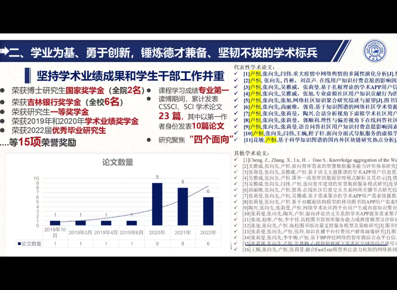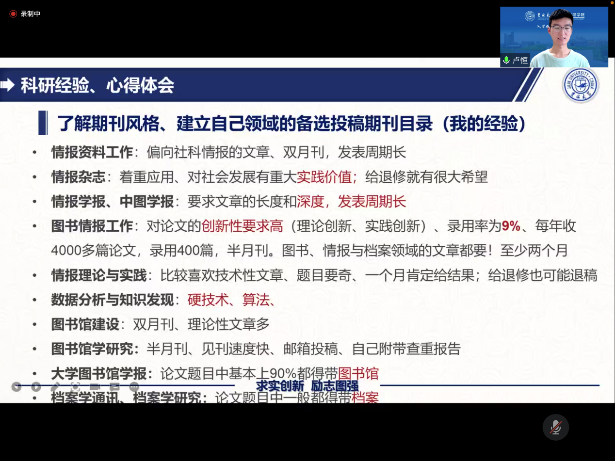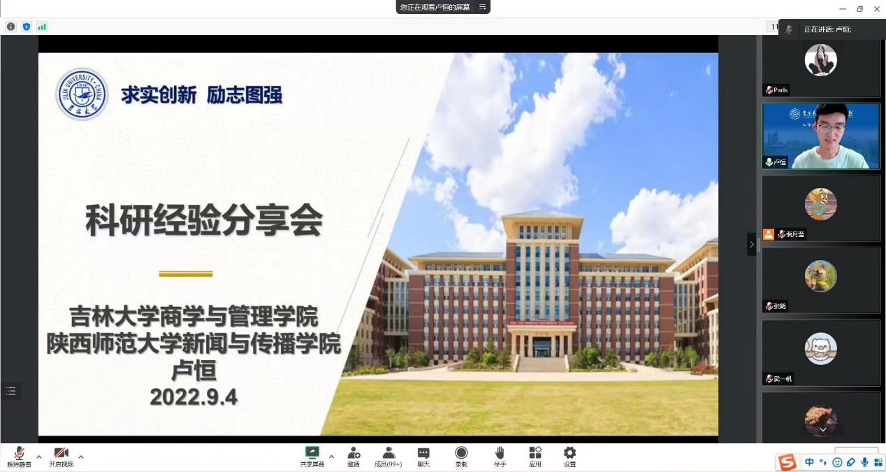 为了让同学们了解如何进行学术研究,营造一个学术氛围浓厚的环境,9月4日,公司邀请了2022级优秀博士毕业生卢恒,于线上开展tyc41183太阳成十佳博士研究生学习经验分享会,向同学们分享自身的科研经验与心得体会。会议由裴月莹老师主持,tyc41183太阳成全体新生参会。