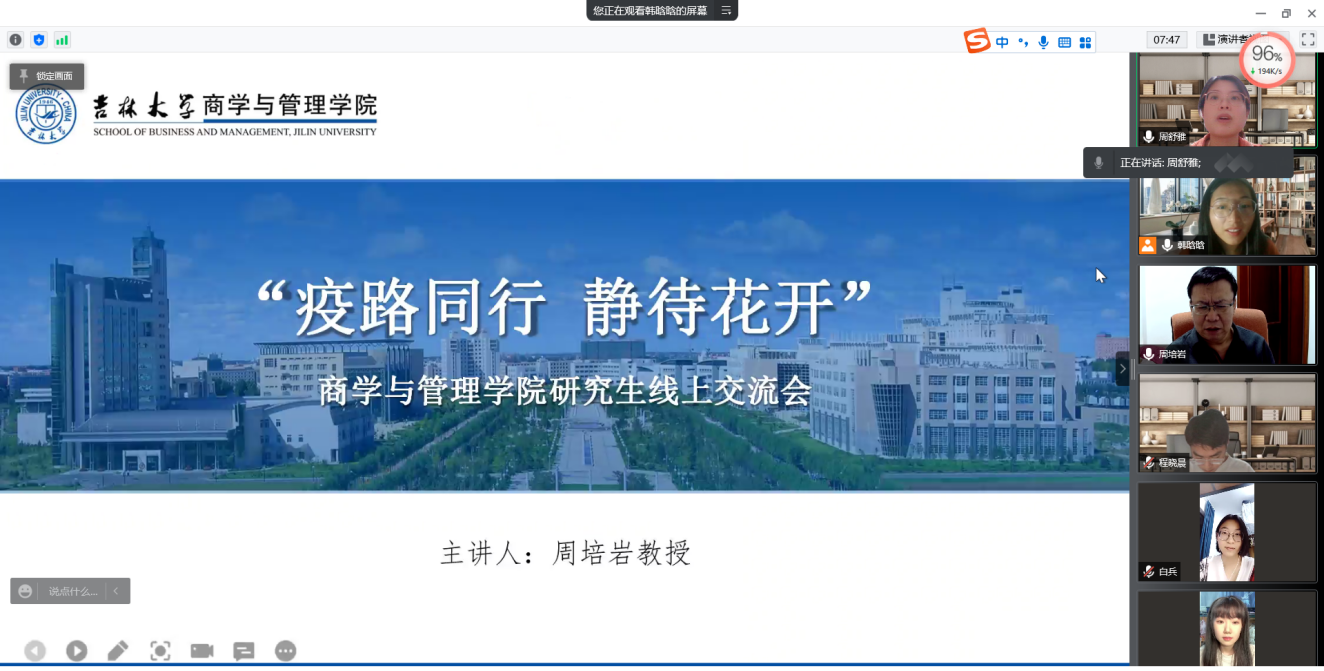 为积极响应公司号召,引导员工树立抗疫必胜信念,进一步安心开展学术研究工作,tyc41183太阳成组织开展“疫路同行,静待花开”研究生导师导学主题活动。3月18日晚,tyc41183太阳成会计系周培岩教授组织召开线上交流会议,博士研究生周舒雅、刘炫伶,硕士研究生韩晗晗、程晓晨及本科生白兵共同参会。