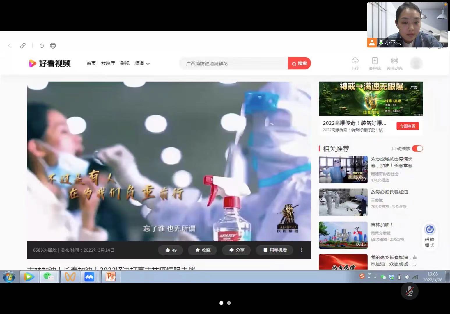 随后,支部所有党员共同观看了“吉林终有吉临时,长春定复往常春”主题微视频。通过观看视频,大家真切的感受到了本次吉林抗疫过程中党员和志愿者的付出,体会到了“从来没有岁月静好,不过是有人在为我们负重前行”的艰辛与担当。
