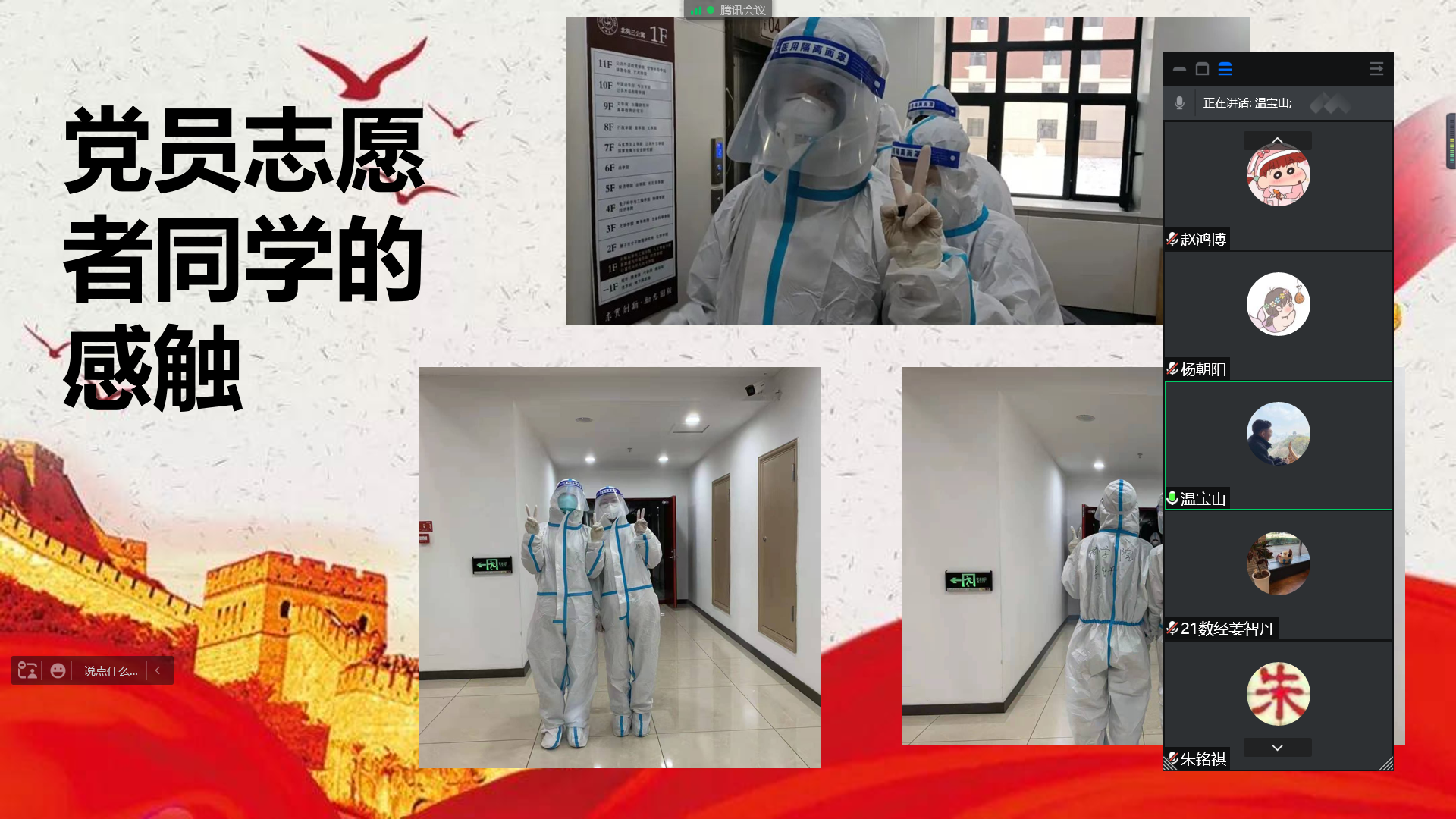 温宝山表示,首先从防控的层级就可以看出此次疫情的严峻程度,连送饭都全副武装成了大白,党员同学们也都积极的为同学们服务,楼道里都能看见我们党员同学的身影,期待在公司、公司的带领下我们可以早日解封。在这次疫情中,我也体会到了志愿精神,看到了自己的价值,更懂得了青年人的使命和担当。或许我们的岗位没有华丽的外饰、没有欢呼与喝彩,但是抗击疫情的战线上却离不开每一位志愿者的奉献与努力。我很荣幸成为这样一名志愿者,贡献着自己的一份绵薄之力。每个个体的力量或许微小,但我相信,当我们戮力同心、合力抗疫,疫情的阴霾终将散去,人们的生活终将恢复到平静与温馨!