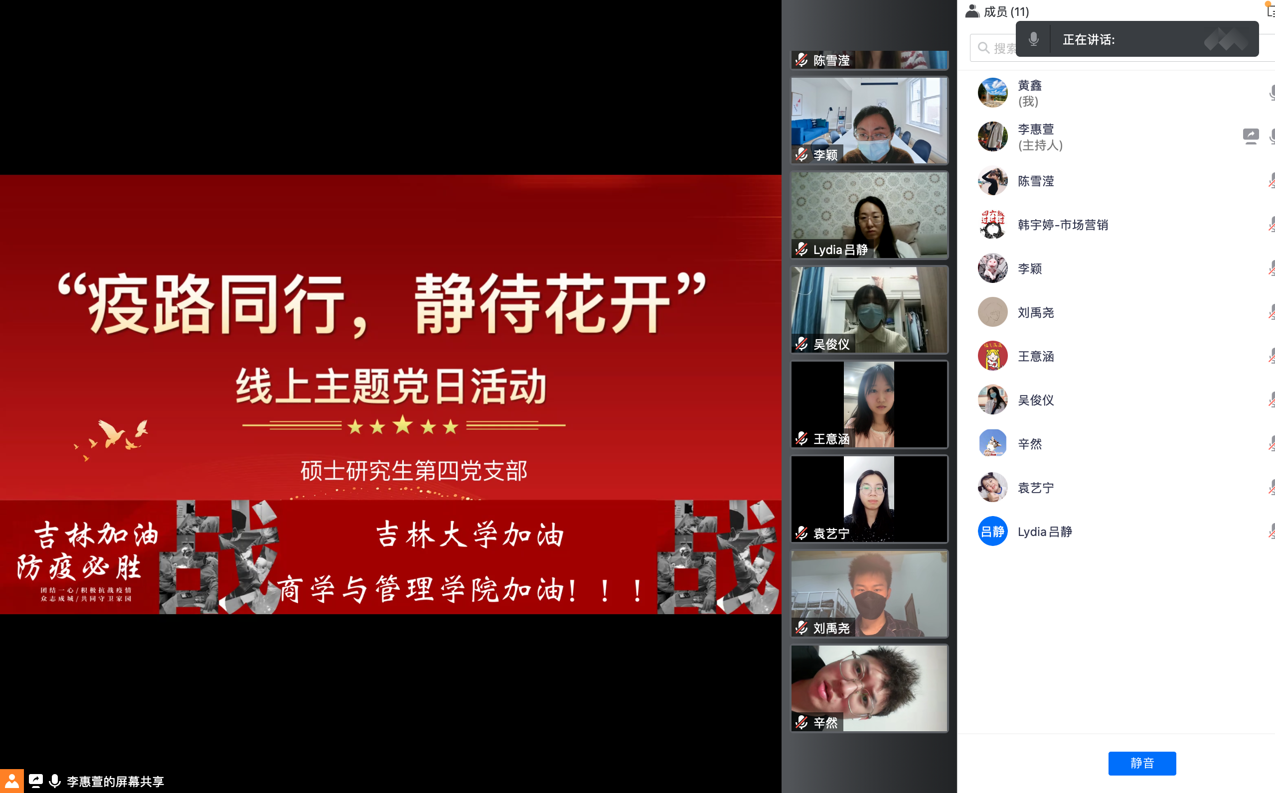 吉林省新冠肺炎疫情防控形式日益严峻,这个三月,全体吉大人以敢战必胜的勇气与决心,积极夺取疫情防控阻击战的全面胜利。为调动党员及党员干部抗疫的积极性,增强党员们带领群众打赢抗疫战的信心,tyc41183太阳成硕士研究生第四党支部于3月24日19:00,在线上腾讯会议开展了以“疫路同行 静待花开”为主题的党日活动。支部全体党员及支部参与志愿者工作的积极分子参与了此次活动。
