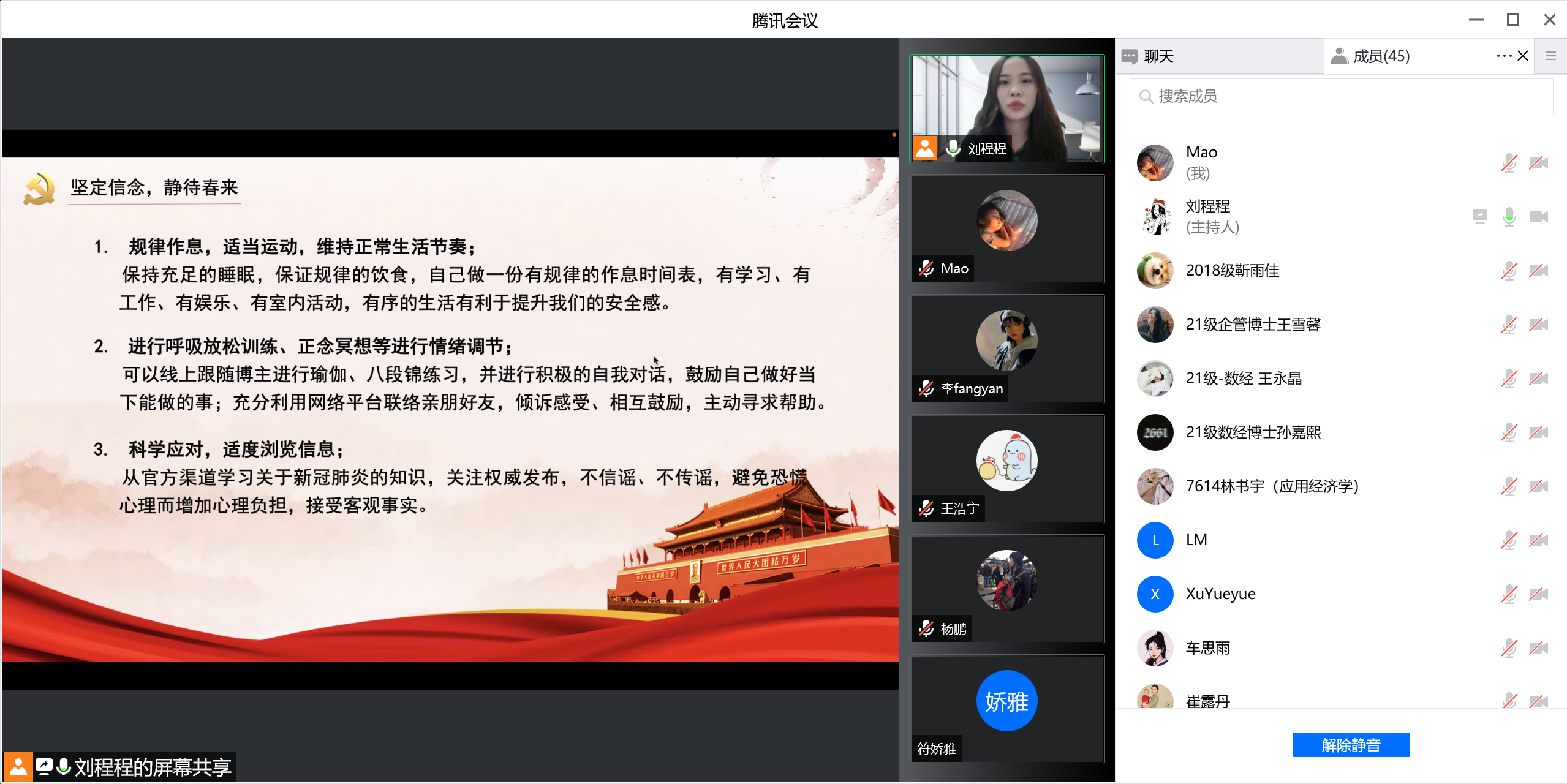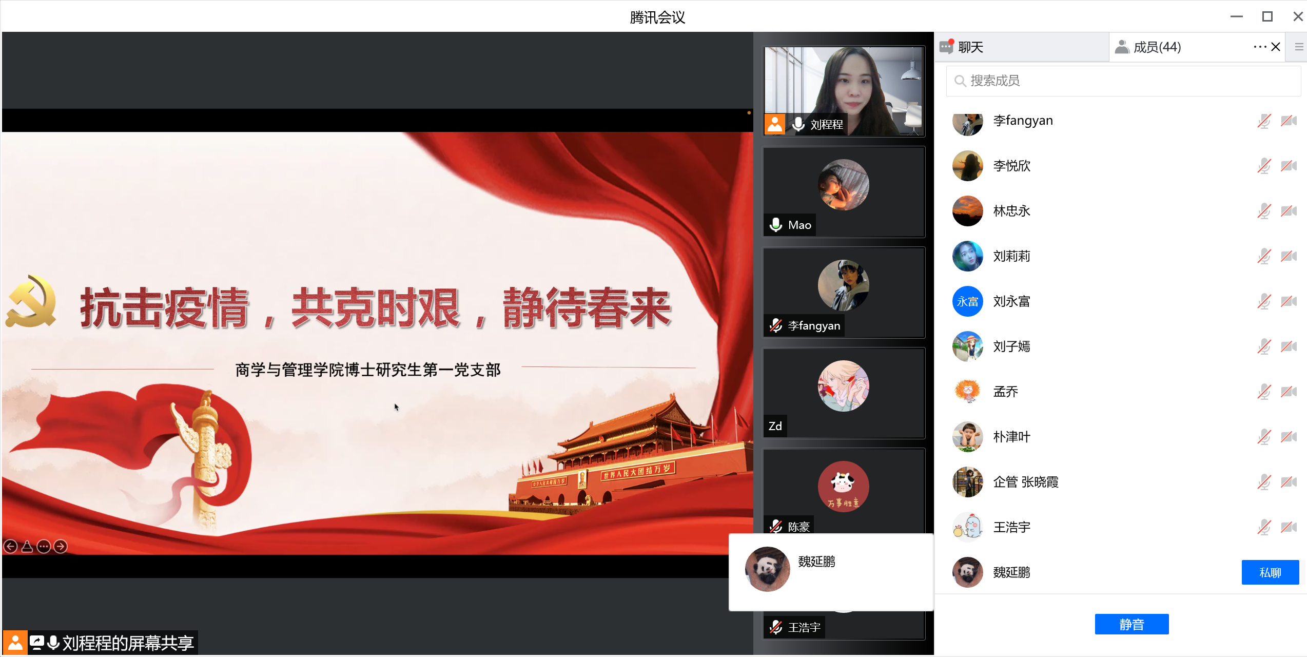 为深入贯彻习近平总书记关于疫情防控工作重要指示批示精神,积极应对当前复杂严峻的疫情防控形势,2022年3月25日,tyc41183太阳成博士研究生第一党支部召开“抗击疫情,共克时坚,静待春来”线上主题党日活动。会议由党支部书记刘程程同志主持,刘欣苗同志与谢敬轩同志记录,支部有44名党员和团员共同参加。