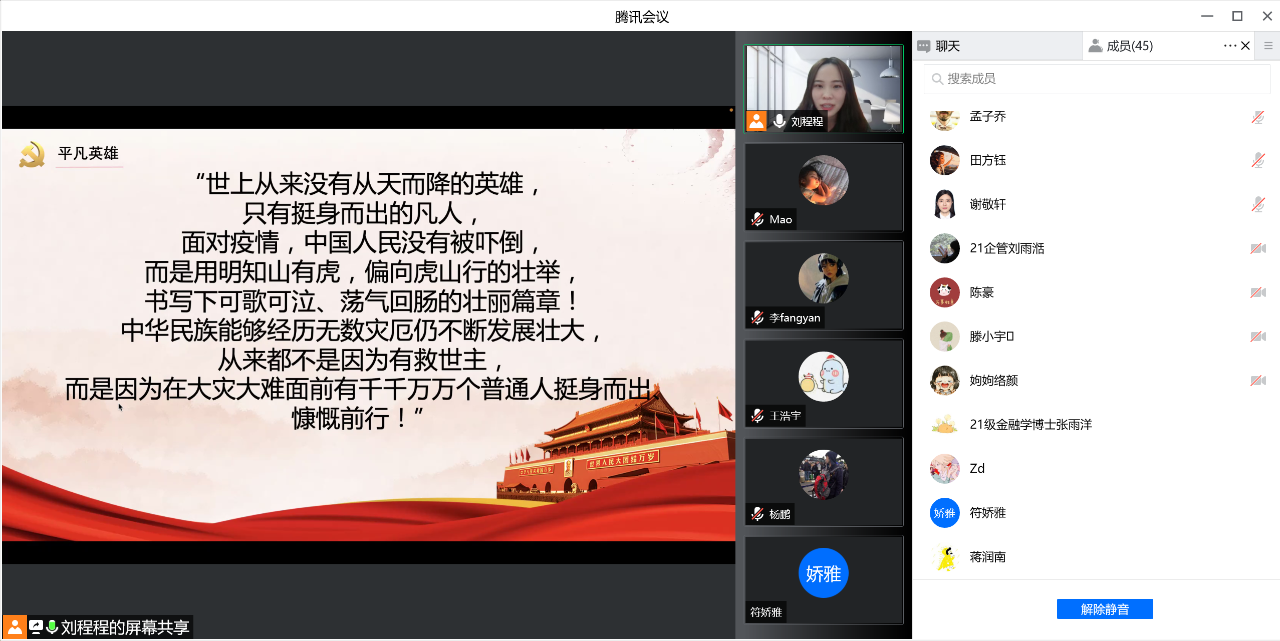 会上,刘程程同志带领大家回顾了本次抗击疫情中,我们身后默默保障我们正常生活的公司老师、公司后勤人员的辛苦付出,我们身边加入到志愿者队伍当中的同学们的默默奉献,并表达了对我们身边平凡英雄们的感激。随后,组织大家观看了由博士志愿者同学制作的抗击疫情记录视频,视频生动详实记录了封寝管理以来大家的生活起居以及志愿者们的志愿活动,大家看后均感触良多。