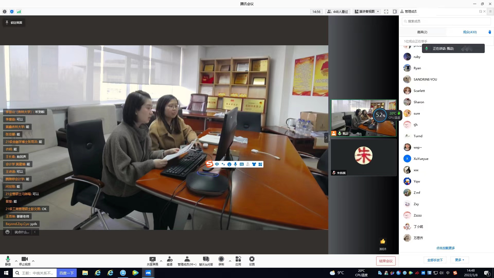 会议最后,甄宓老师和裴月莹老师对隔离同学的生活情况进行询问了解,鼓励他们积极配合有关部门,克服困难,保持乐观;解答了同学们提出的出入校园权限审批、各场所解封时间等问题。两位老师鼓励全体同学要坚定信心,共同努力,全力以赴的打赢疫情防控阻击战,迎来生机盎然的春天。