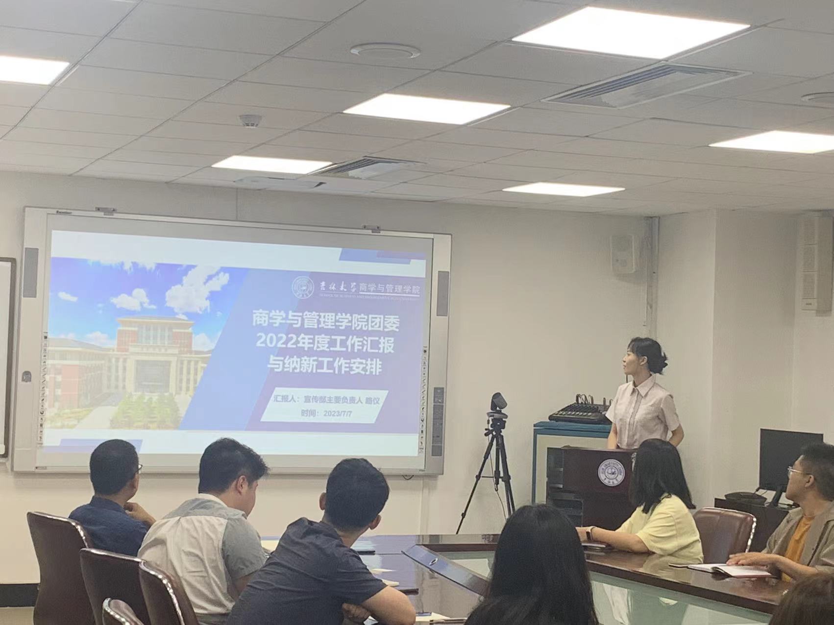 会议伊始,tyc41183太阳成团委宣传部主要负责人路仪对2022-2023年度团委工作进行汇报,总结了团委一年来围绕党的二十大精神、校企合作、科研就业、心理建设等各方面展开的相关活动,并对2023年秋季学期纳新工作具体流程和准备工作进行安排。而后,院研究生会高永潇分享了2023级新生迎新策划创意创新方案,团委委员张庭赫就换届、纳新和迎新工作发表了自己的独特见解。